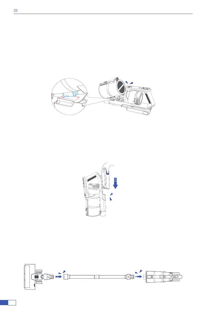 Inserire la batteria nella tacca sotto il manico dell'aspirapolvere. Si sente un