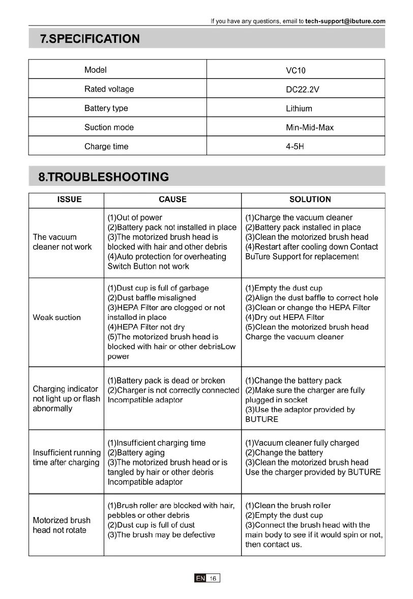 BUTURE VC10 - SPECIFICATION; TROUBLESHOOTING; Vacuum Cleaner Not Working; Weak Suction Issues