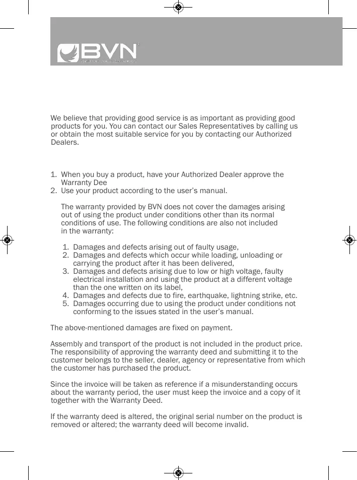 The warranty provided by BVN does not cover the damages arising