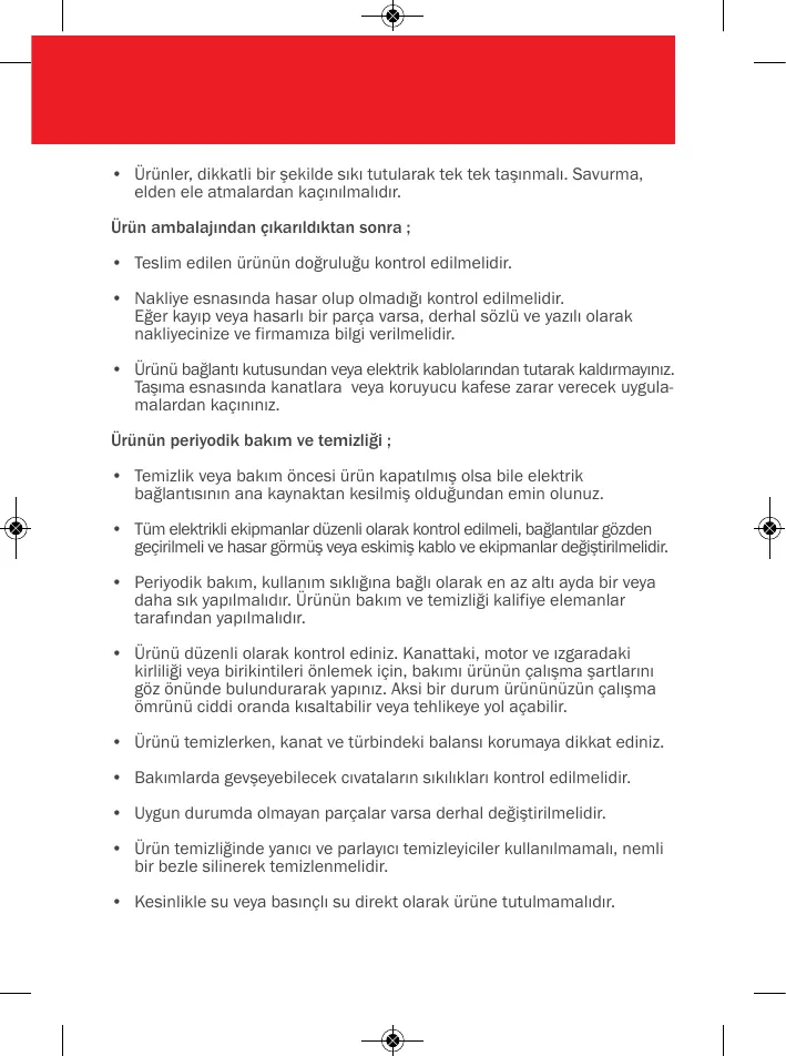 • Ürünü düzenli olarak kontrol ediniz. Kanattaki, motor ve ızgaradaki