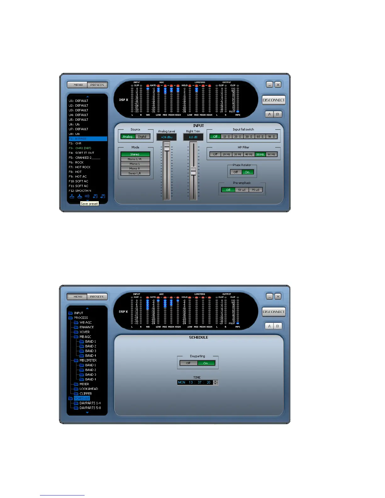 loaded into the DSPXmini-HD. The preset location that is loaded is the currently highlighted (in blue) preset, not