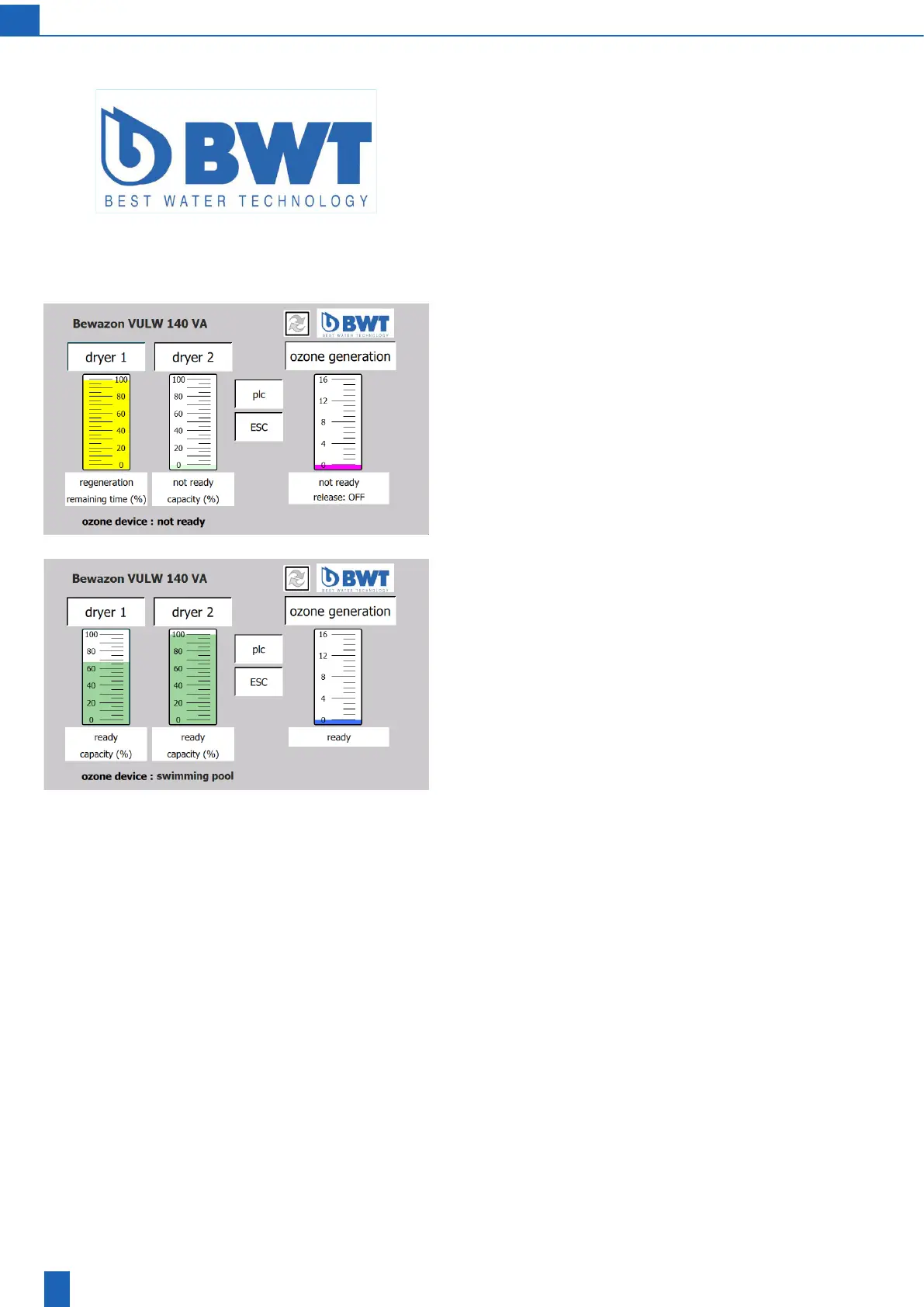 touch-sensitive. After the plant is switched on, the “BWT” screen appears