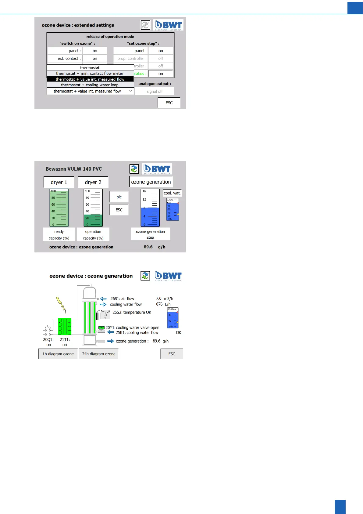 Next screens: Ozone generation diagram, cooling water loop diagram,