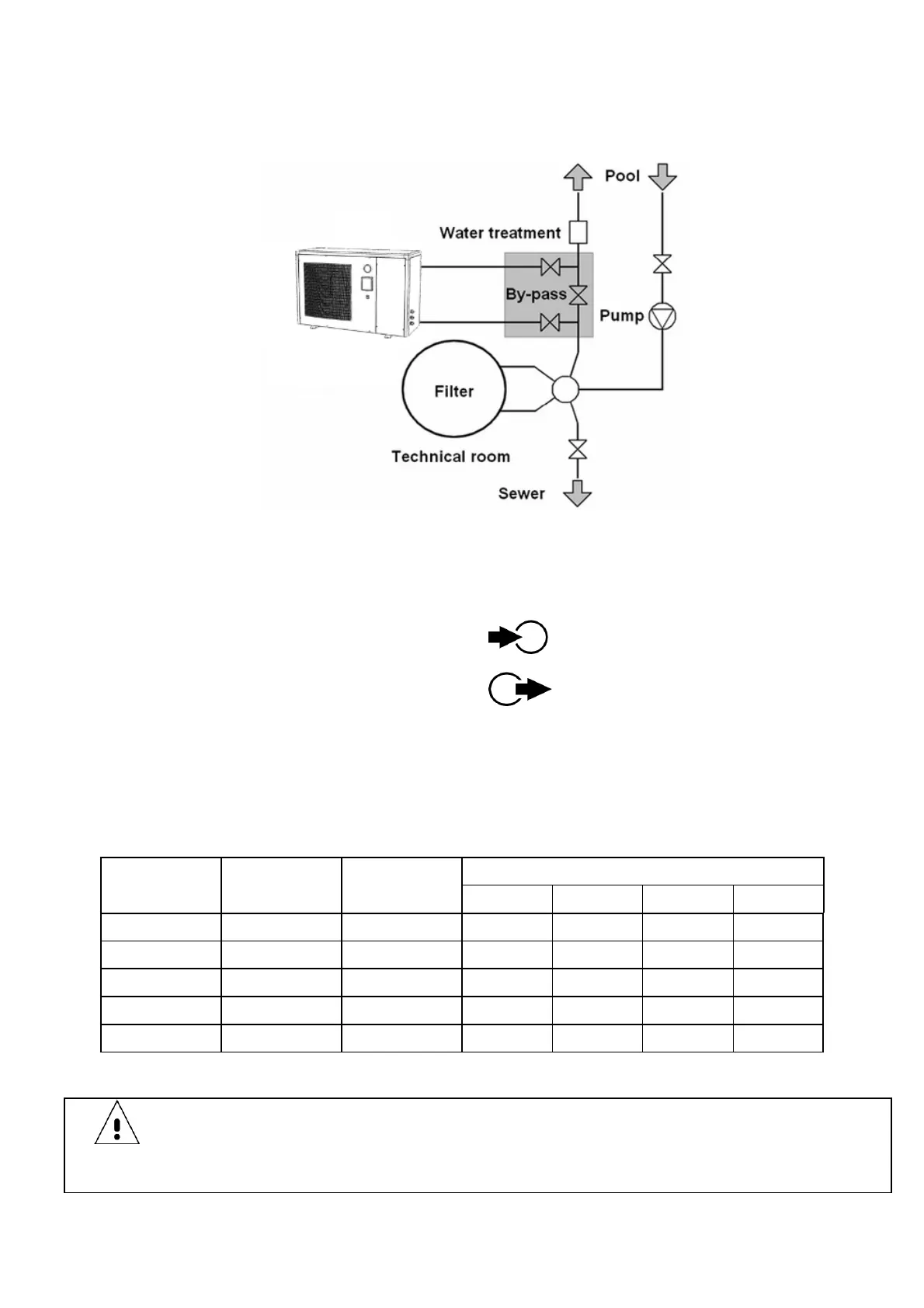 The heat pump should be connected to a filtration circuit trough a by-pass who consists of 3 valves.