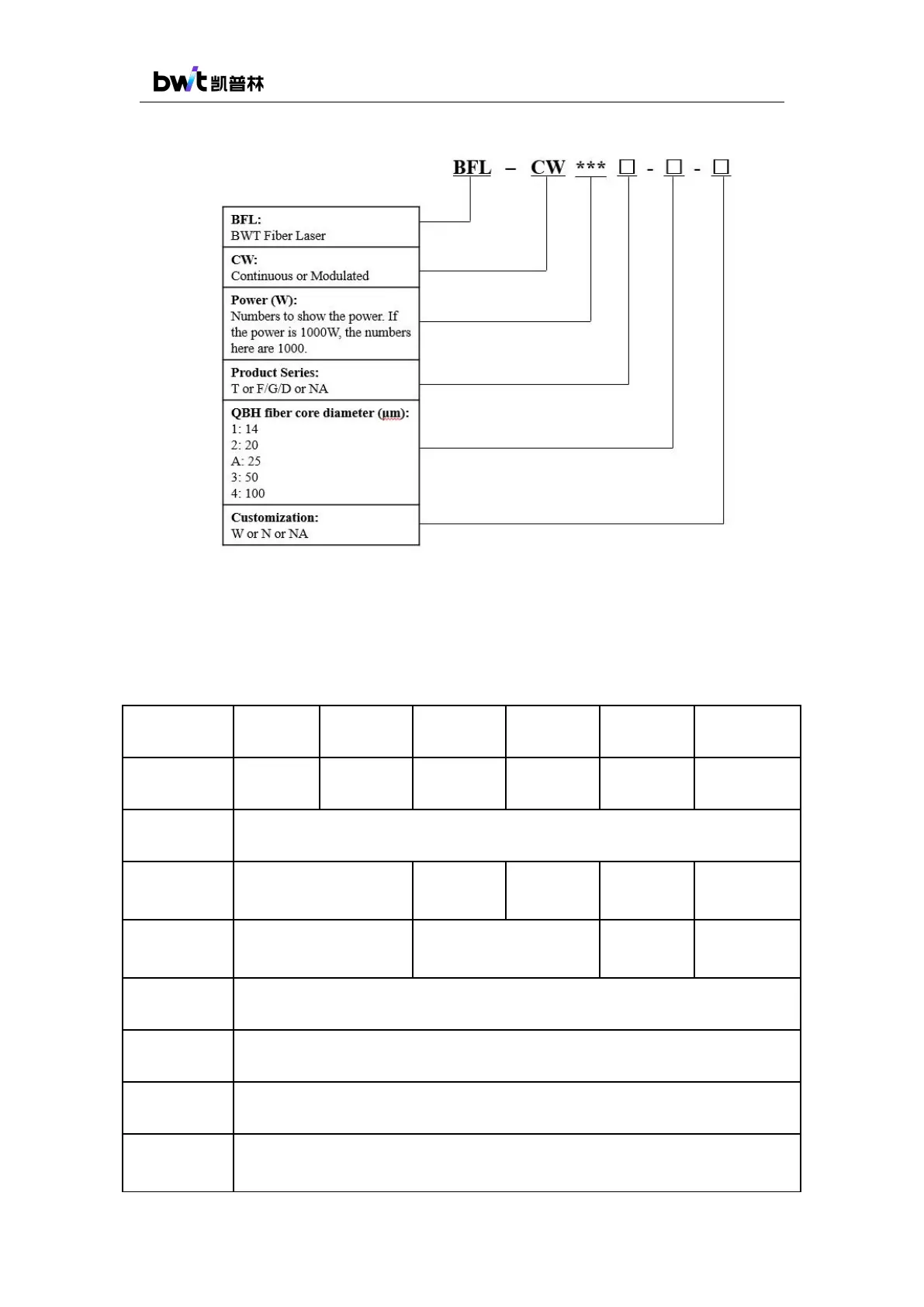 The technical specifications of BWT Lightning series fiber lasers are shown in Table 2 below.