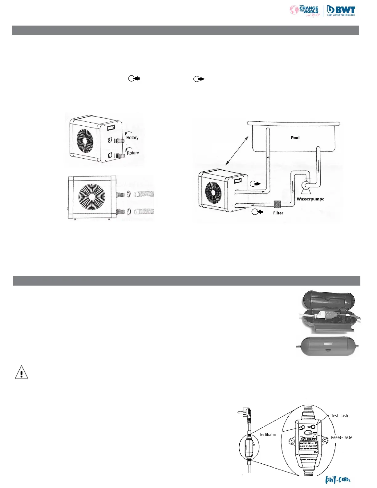 • Die WP ist mit jeder Art von Wasseraufbereitung kompatibel. Die WP ist zwingend mit einem PVC-Schlauch von ø 38 mm an den Wasserkreislauf des