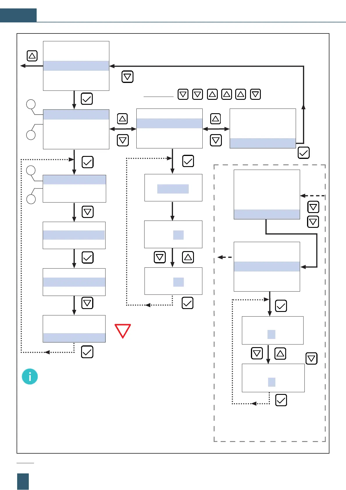 Fig. 14: Struttura del menu: „MODO FUNZIONAMENTO“, „DISINS. PRESSIONE“ e „TEMPO DI RISCIACQUO“ – schema esemplare