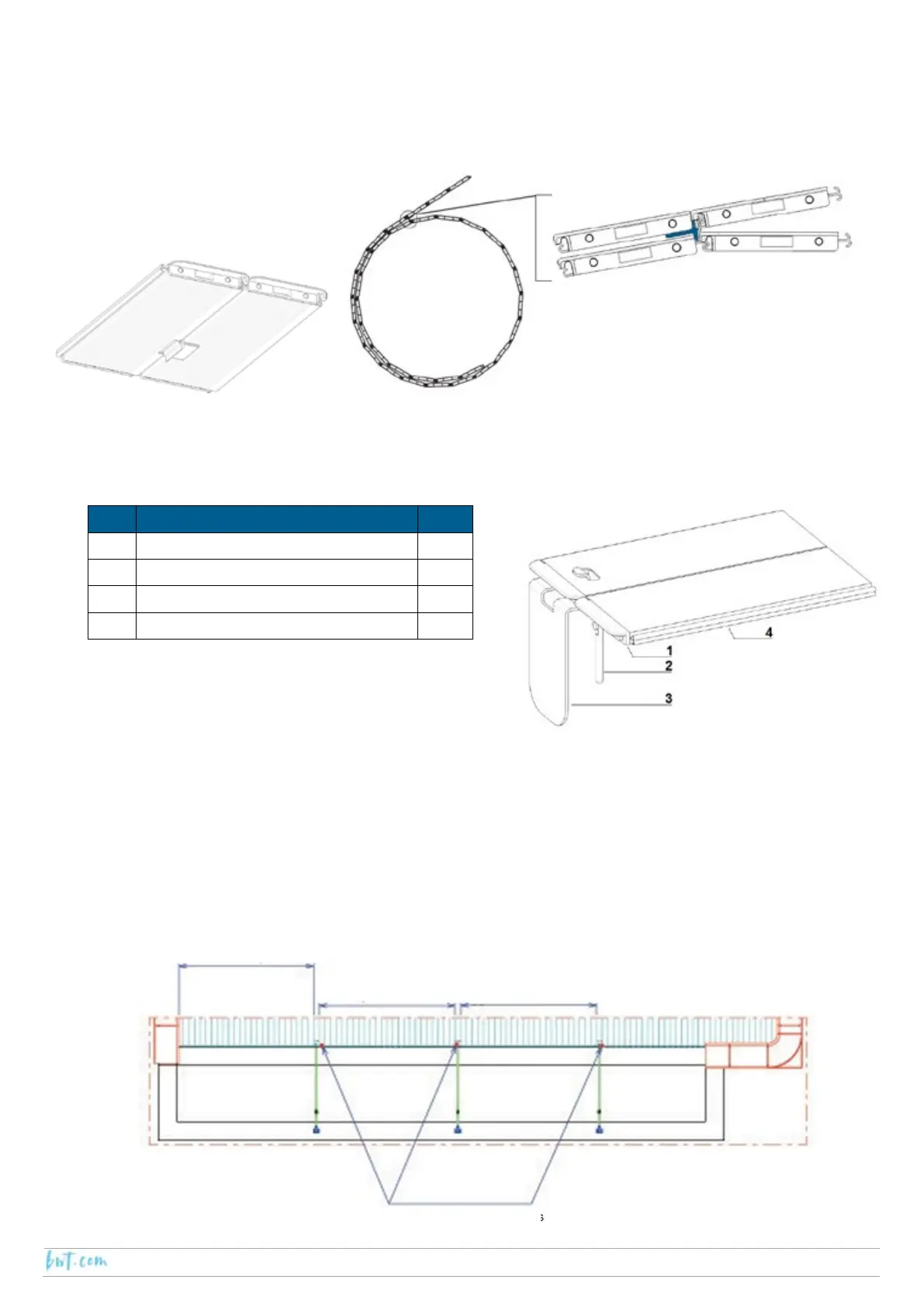 The guide weight (2) is mounted on the overflow slat in the factory. Its purpose is to guide the cover apron while