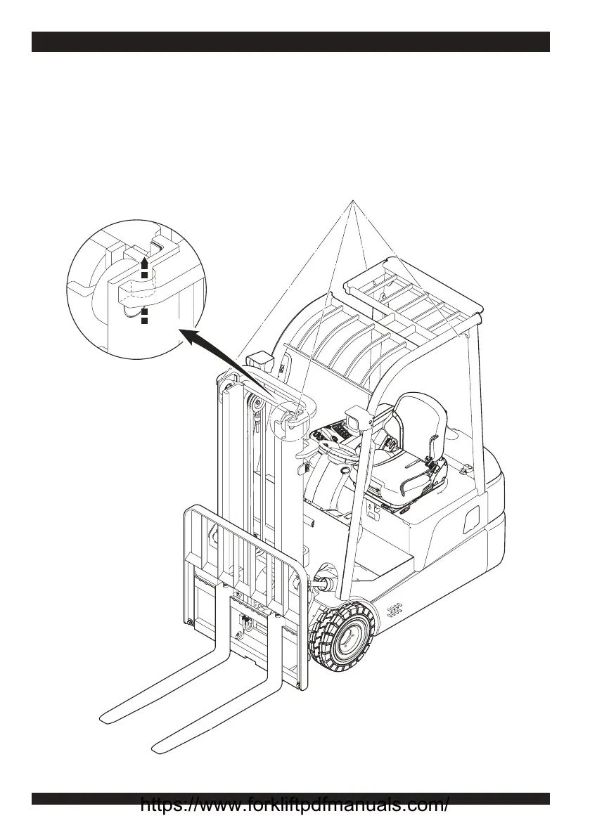 When lifting the forklift with a crane, secure the swings to the attachment points near the top