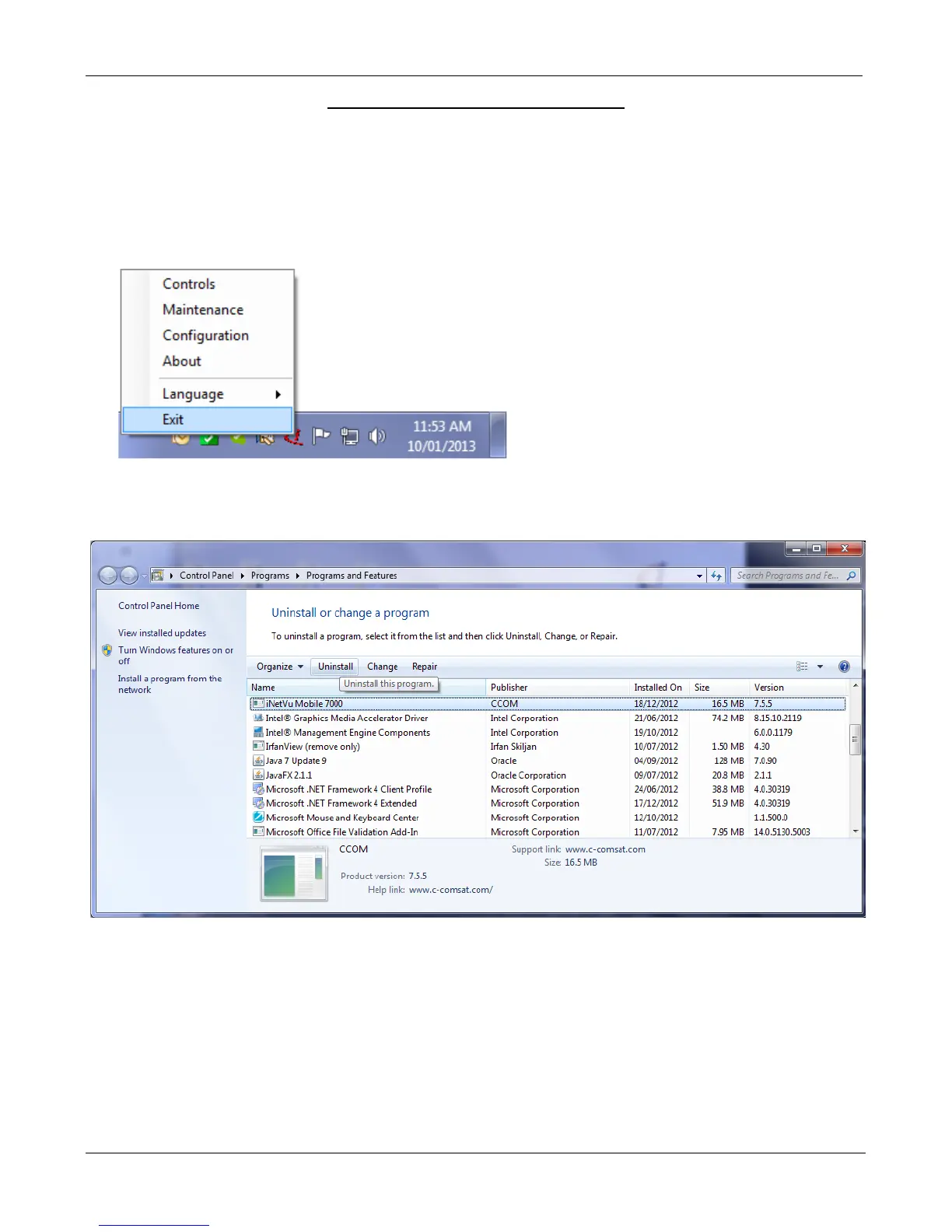 2. Go to the Windows Control Panel and uninstall the iNetVu Mobile 7000 software.