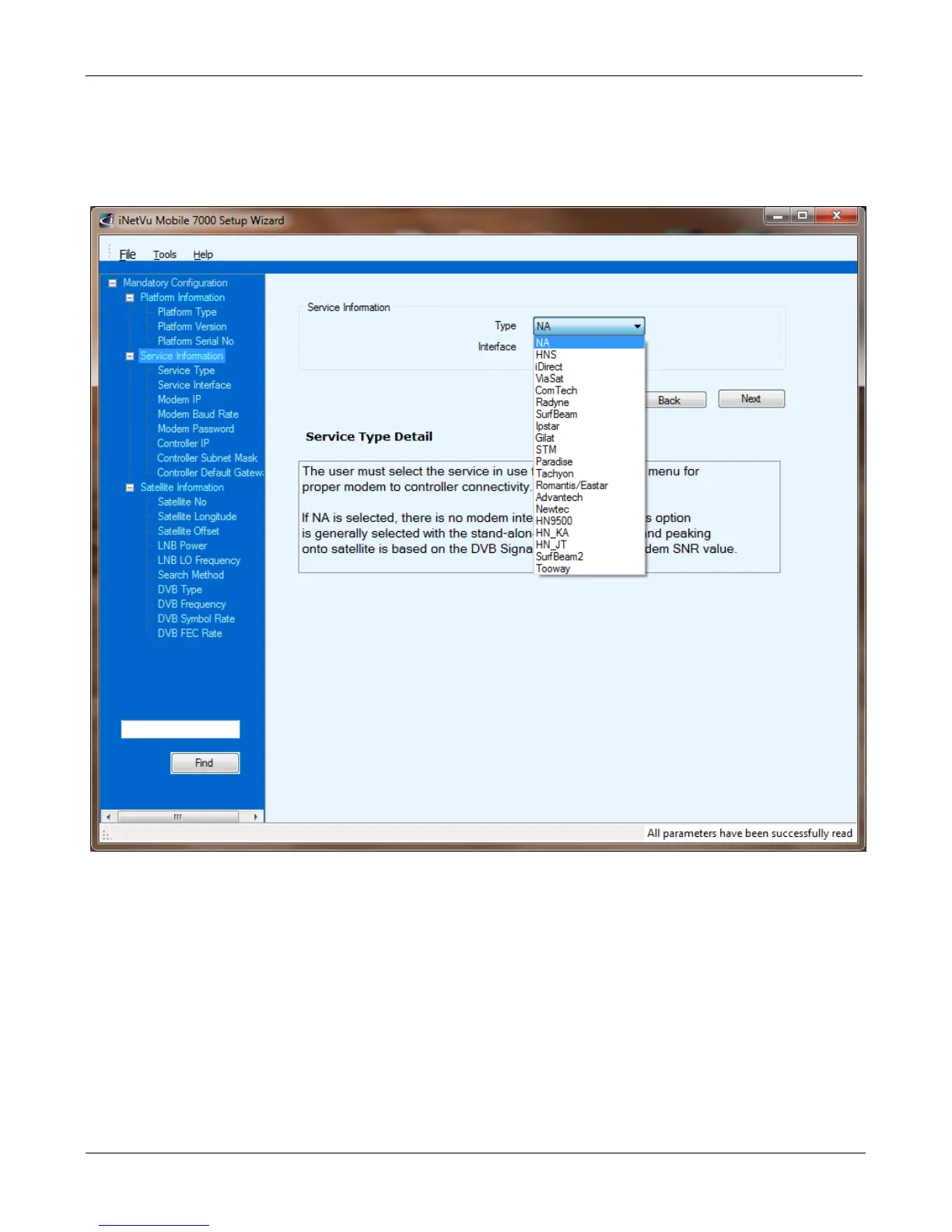 5. Configure the Service Information (Modem). If no Modem is to be used please select NA. If no