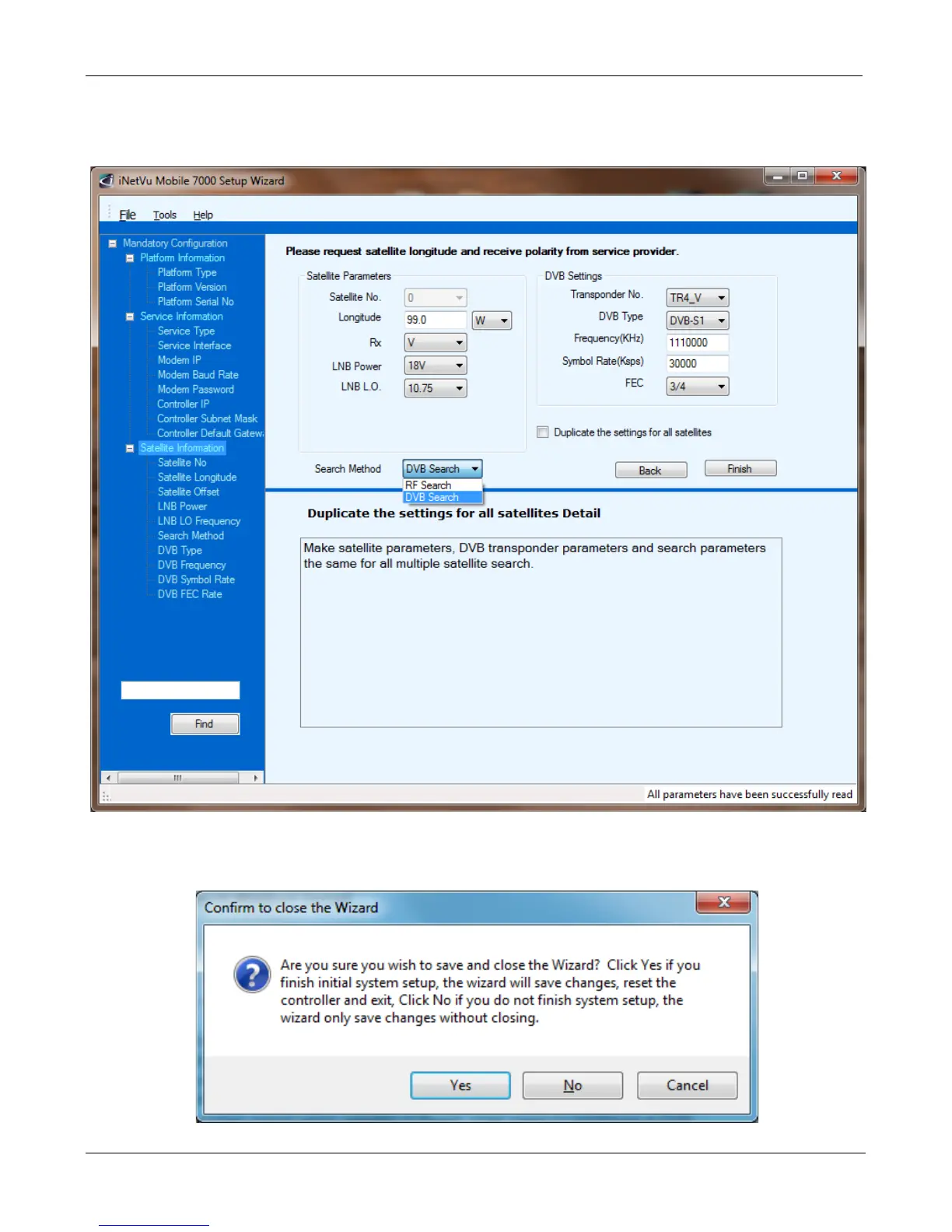 6. Configure the Satellite Parameters. If no DVB Carrier is to be used you must select RF Search.