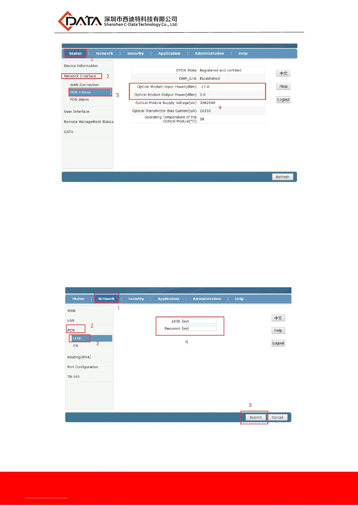 1.web login ONU select the Network -> PON -> LOID, you can set and view the