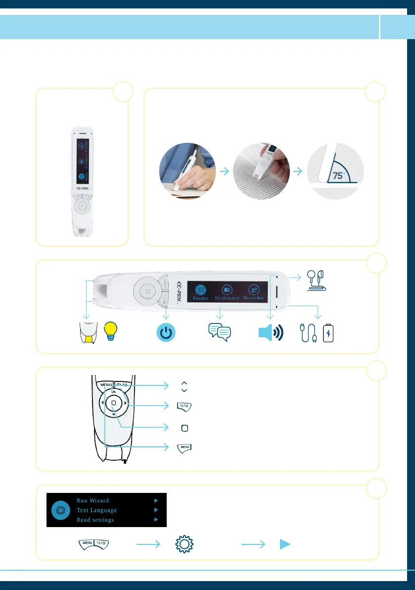 C-Pen READER 2 - HOW TO SCAN; Scanning Pen Holding Technique; Arrow Button Navigation; Setup and Reset Procedures