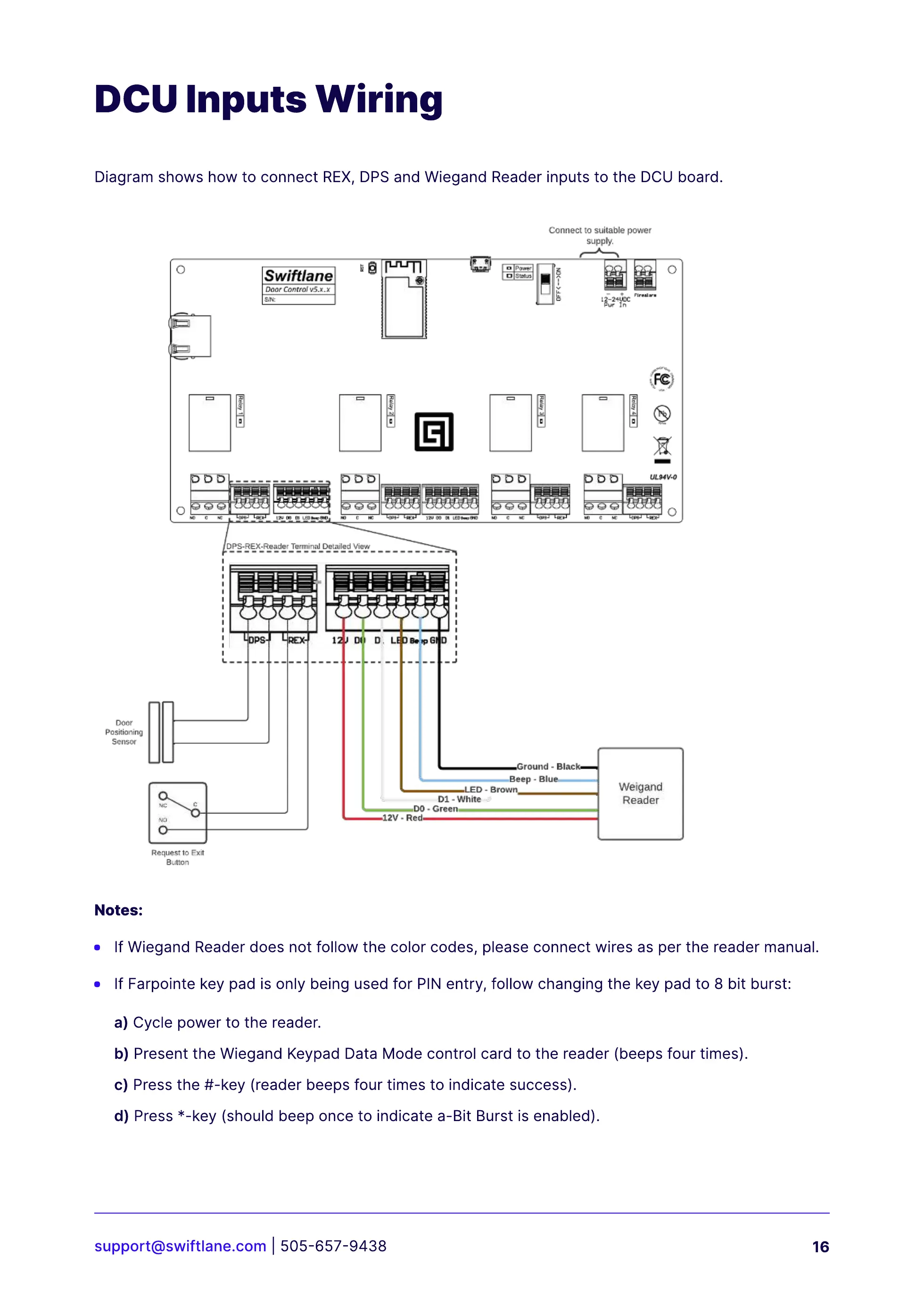 Diagram shows how to connect REX, DPS and Wiegand Reader inputs to the DCU board.