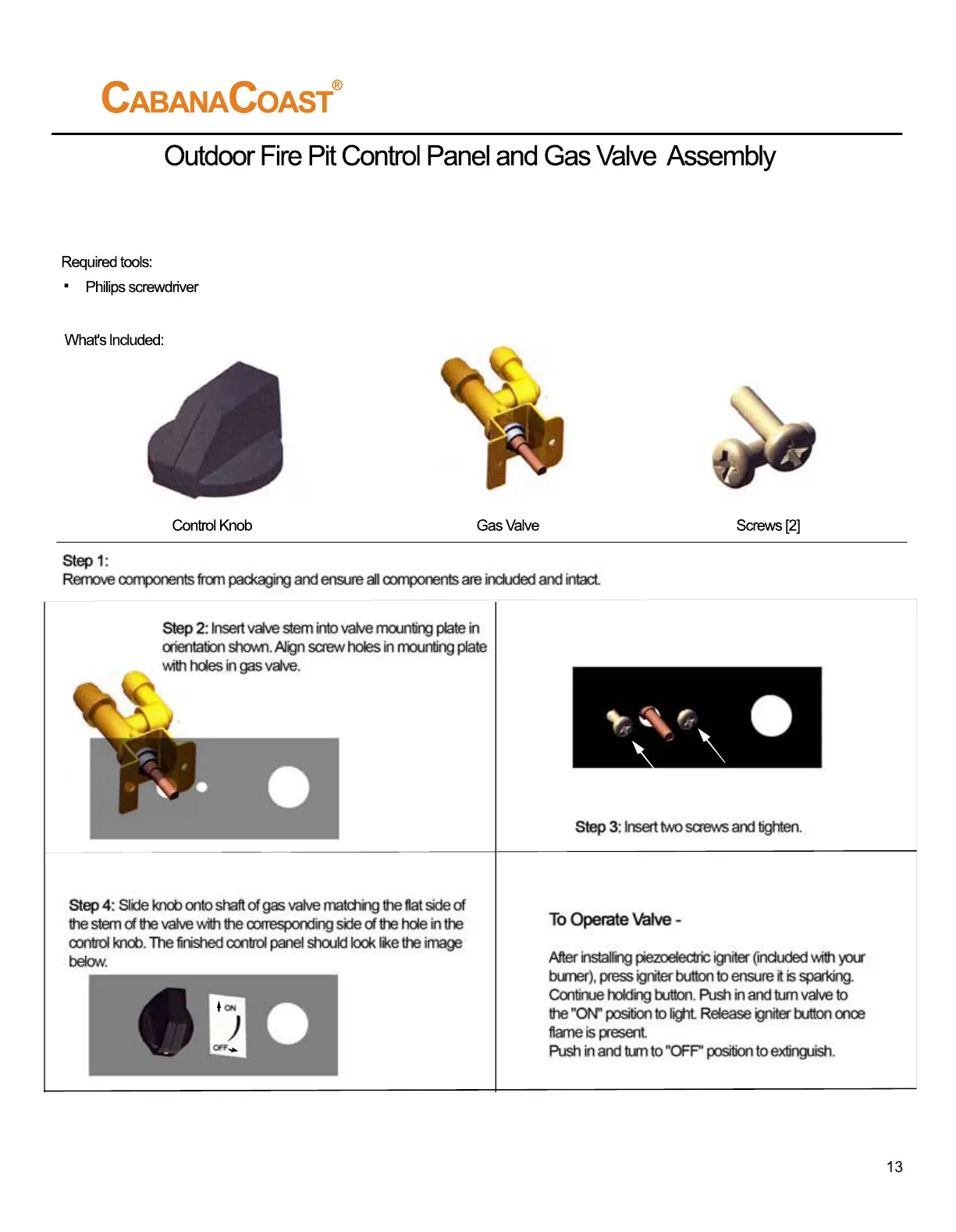 CabanaCoast CB-20 - 9. Control Panel and Gas Valve Assembly; Control Panel Assembly; Operating the Gas Valve