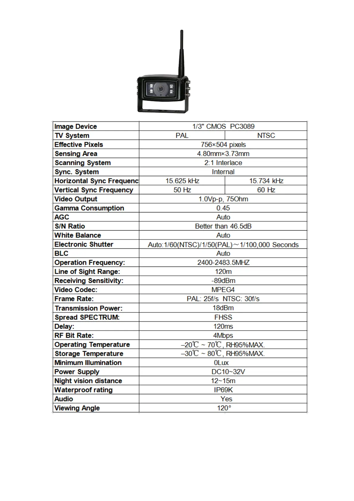 CabCAM A-CDW7M1C - Waterproof Camera Specifications