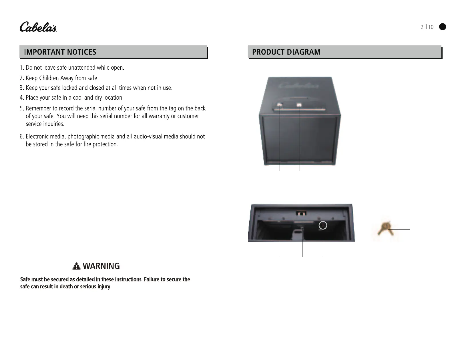 Cabela's 55B30BP - Important Notices; Product Diagram; Photo of Outside of Safe; Photo of Inside of Safe