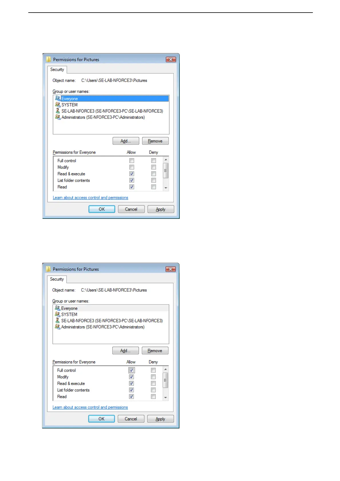 Click on the Allow boxes to grant Full control and Modify permissions. Click OK