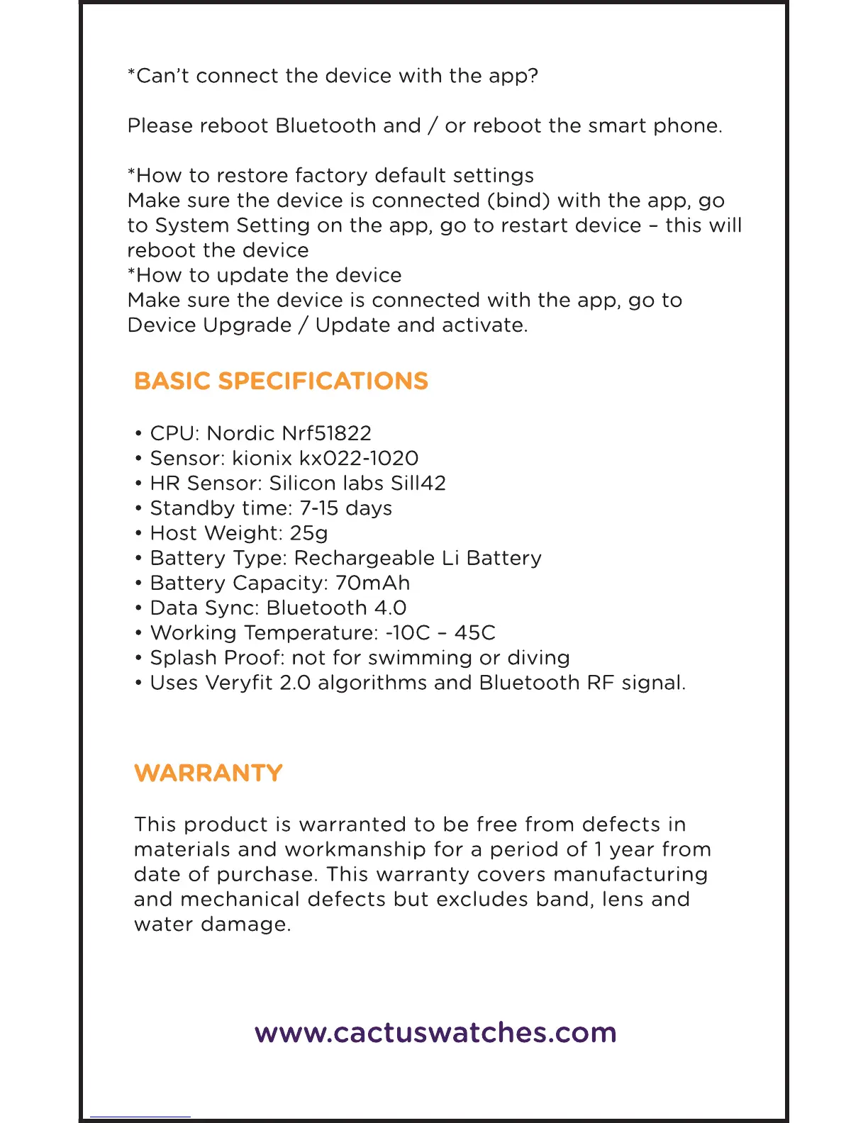 Cactus Activity Tracker - Cant connect the device with the app?; How to restore factory default settings; How to update the device; BASIC SPECIFICATIONS
