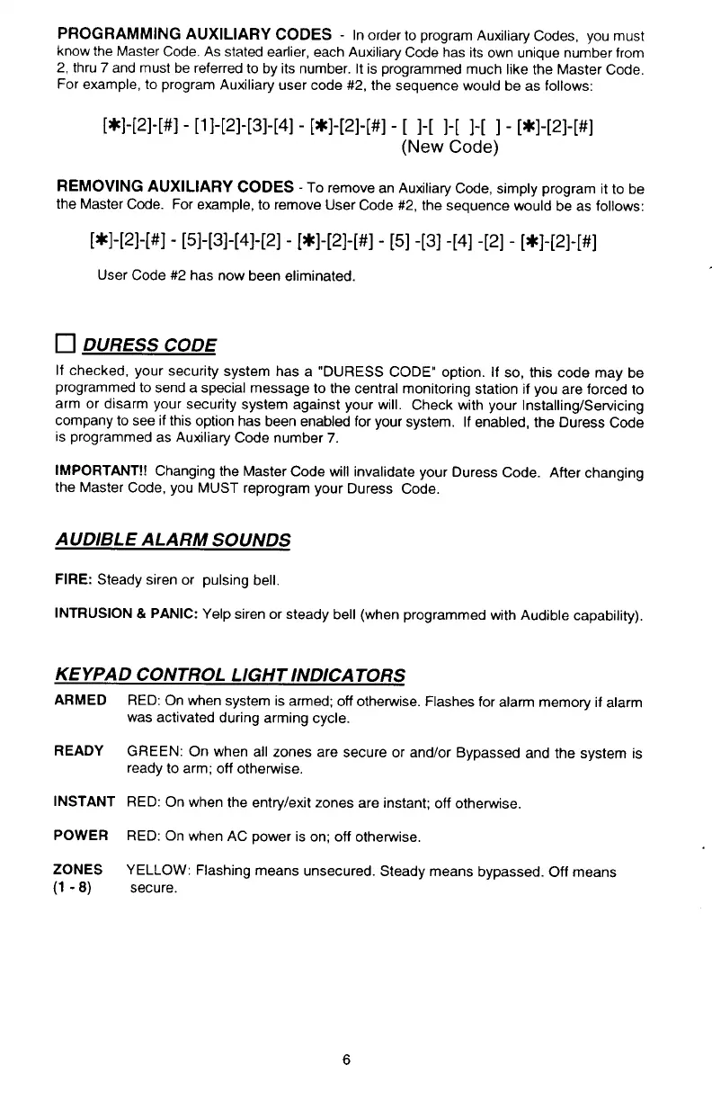 CADDX Ranger 8980 - Code Management and System Reference; Programming Auxiliary Codes; Removing Auxiliary Codes; Duress Code