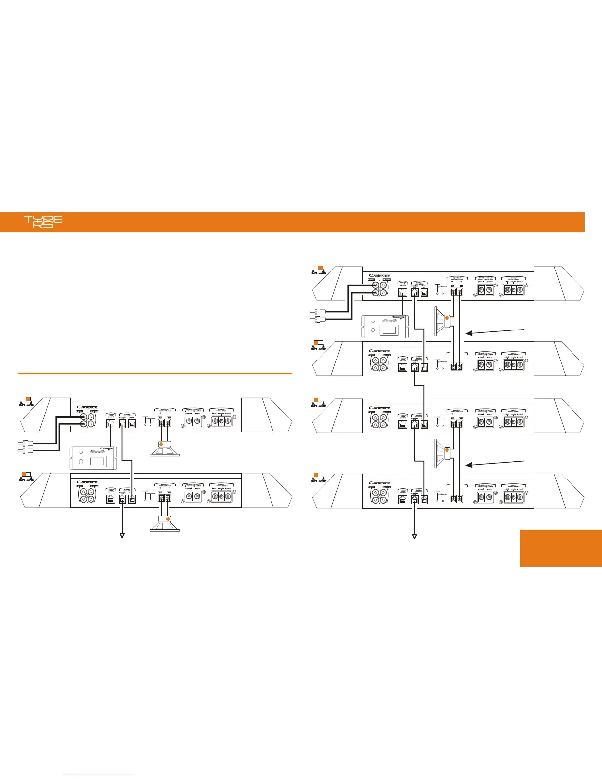 crossover and filters, as well as remote control, if connected, will control all slaves. Do not