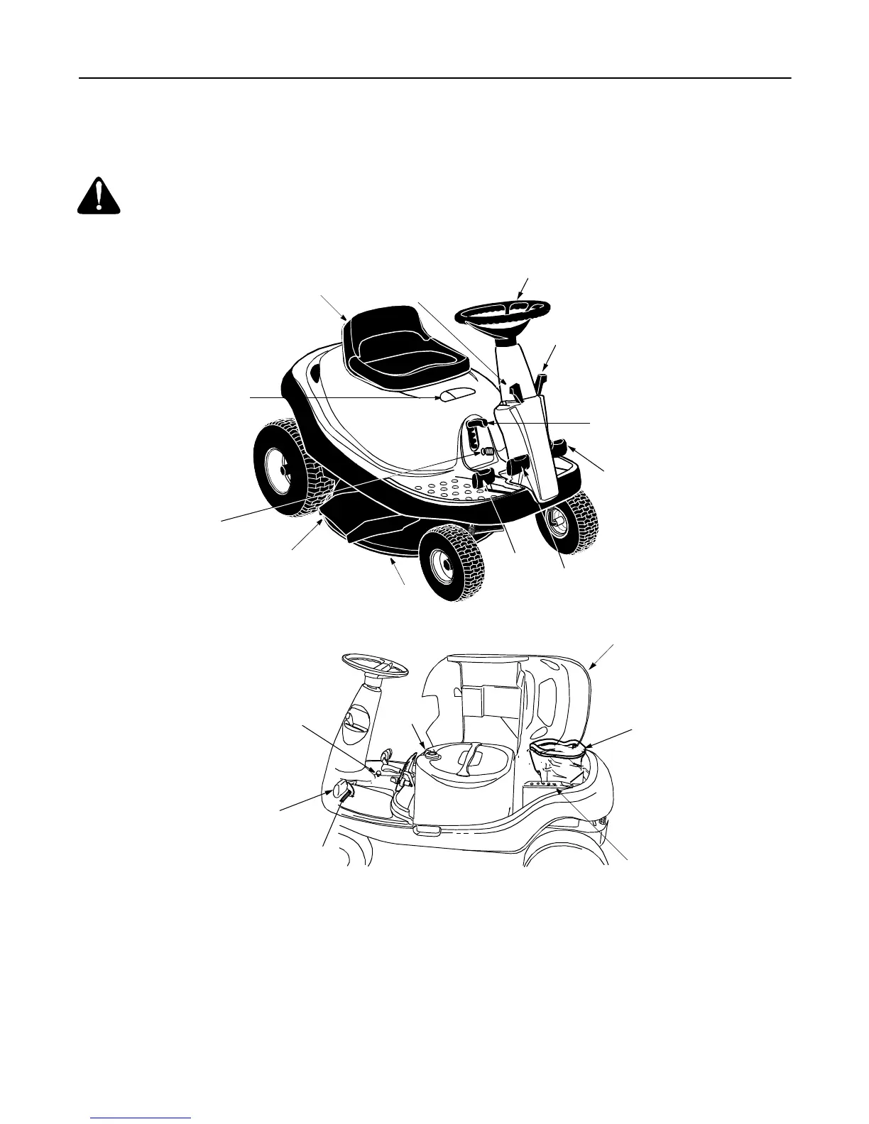 Compare the illustrations in Figure 8 with your riding mower to familiarize yourself with the location of various