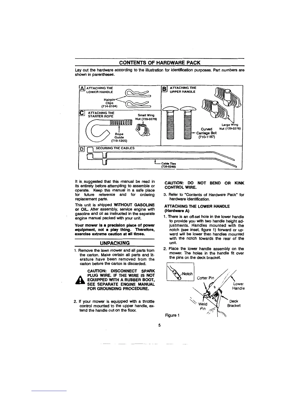 Cadet 106 - Assembly and Unpacking; Hardware Pack Contents; Unpacking the Mower; Attaching Lower Handle