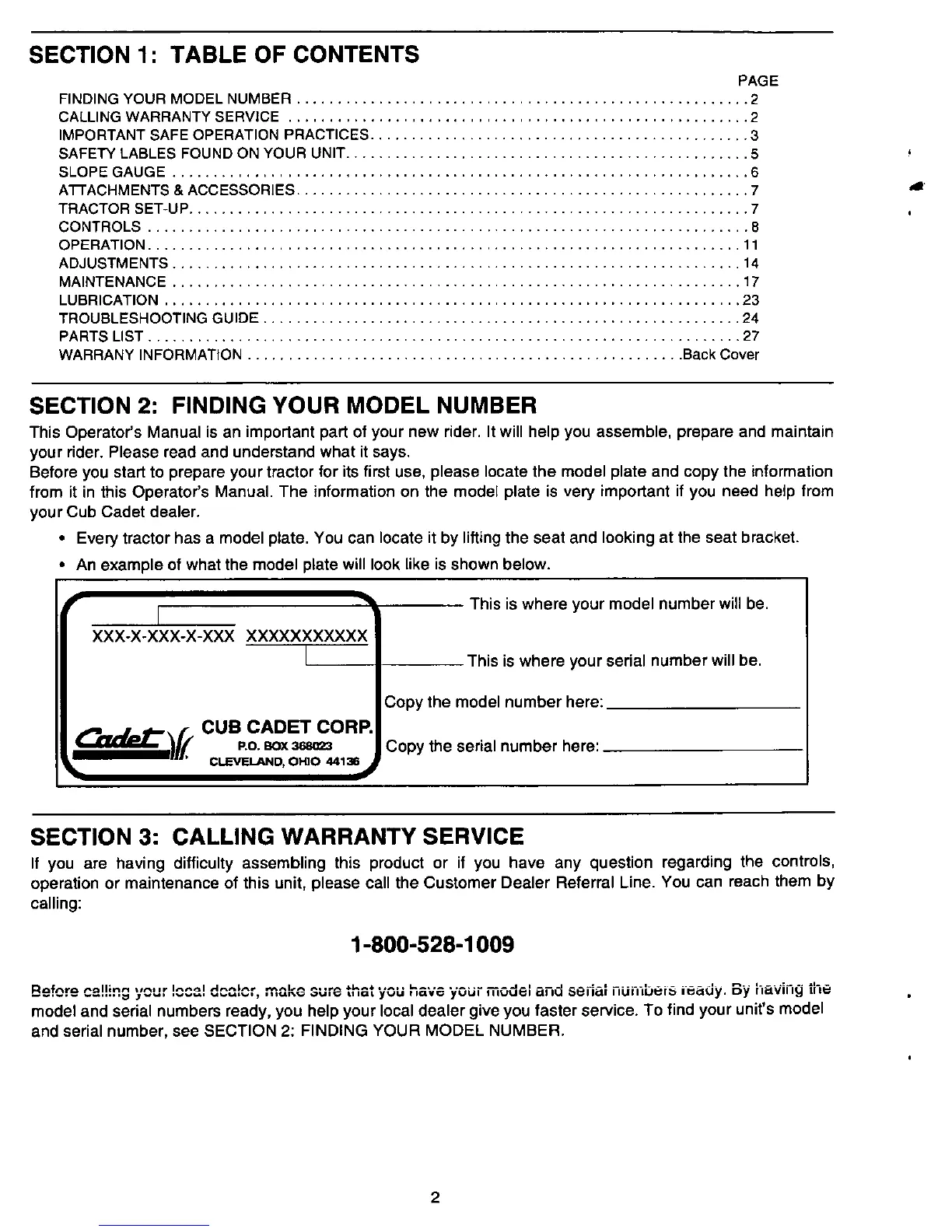 Cadet 1600 - Finding Your Model Number; Calling Warranty Service