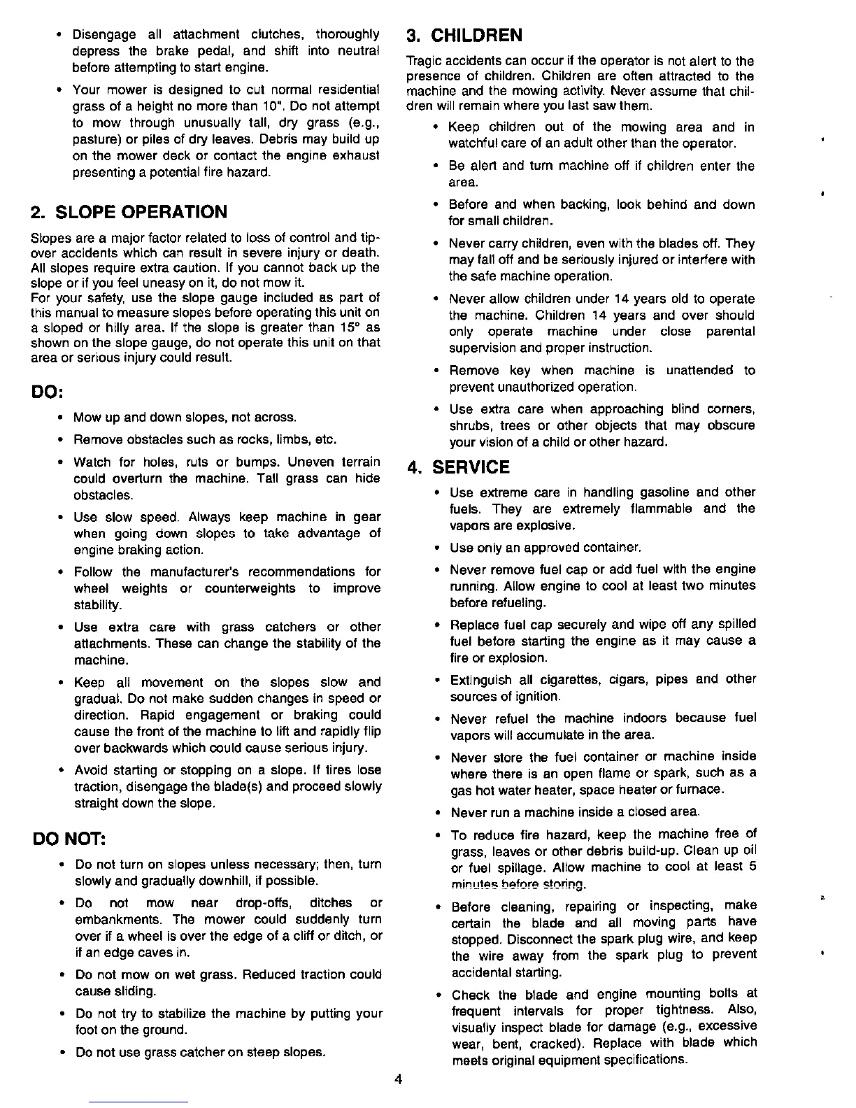 Cadet 1600 - Important Safe Operation Practices (Continued); Slope Operation Safety; Children Safety Precautions; Fuel and Service Safety