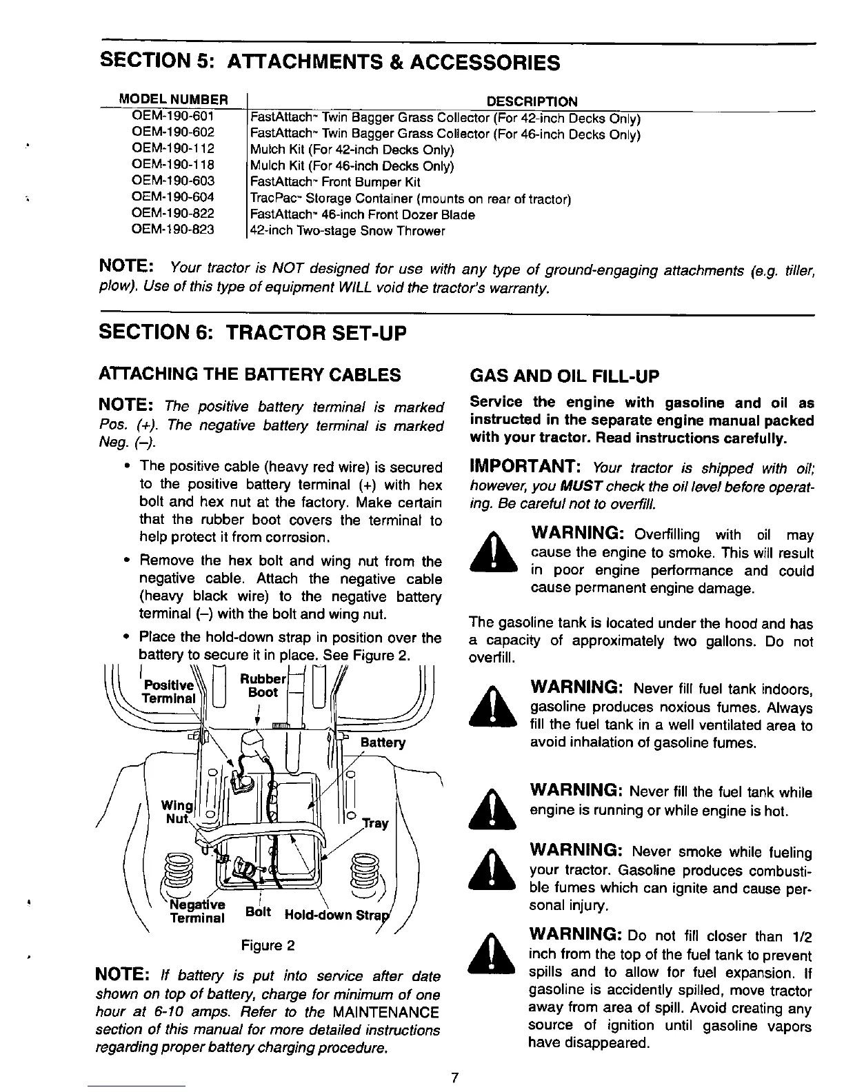 Cadet 1600 - Tractor Set-Up Procedures; Attaching Battery Cables; Gas and Oil Fill-Up; Attachments & Accessories