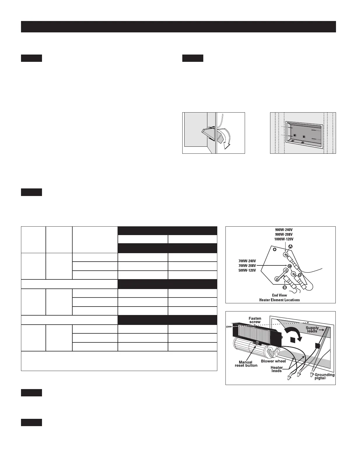 Set the heater assembly (blower wheel rst) into the left side of the wall can. Fasten at top with screw provided. Unlace heater lead