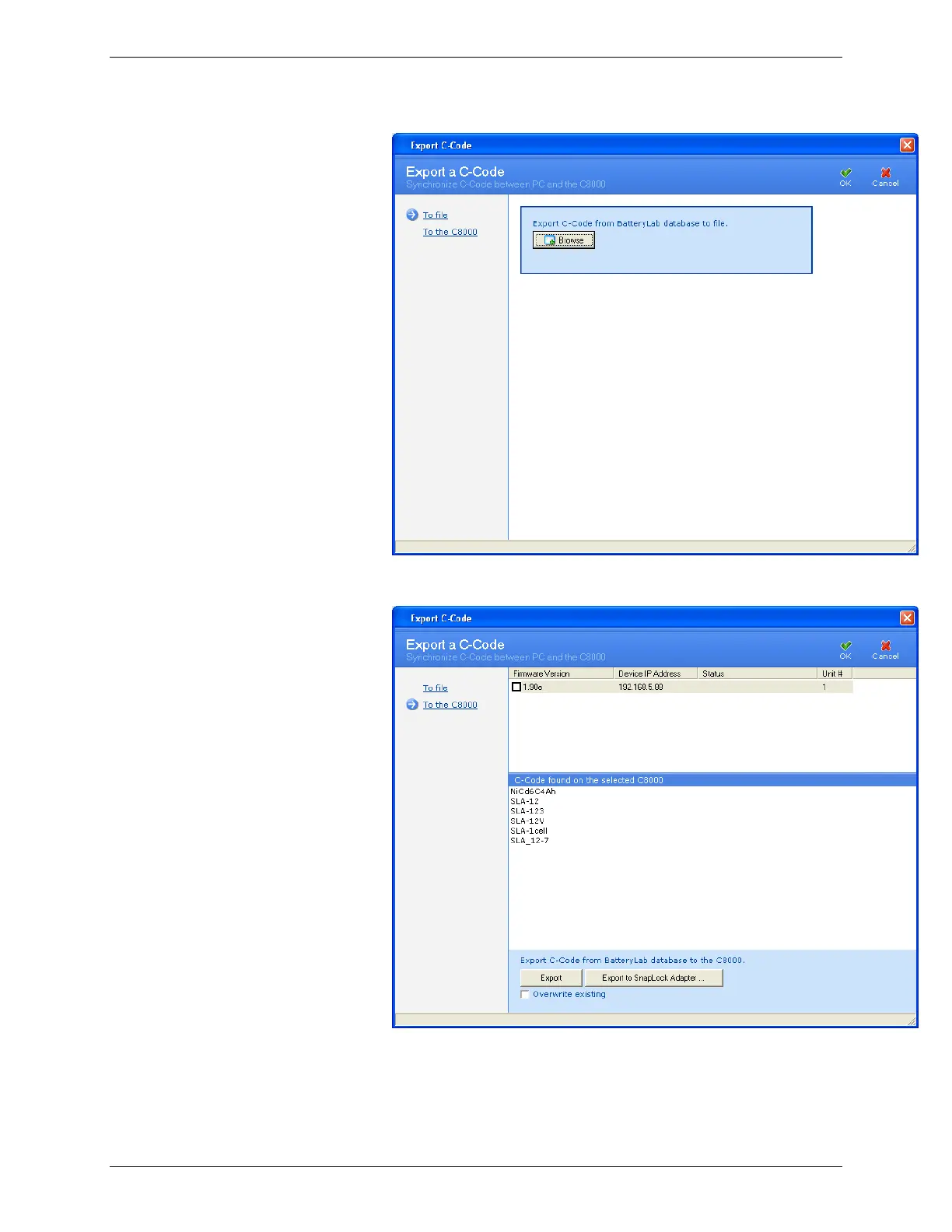 4. Click To the C8000. The Import/Export window appears.