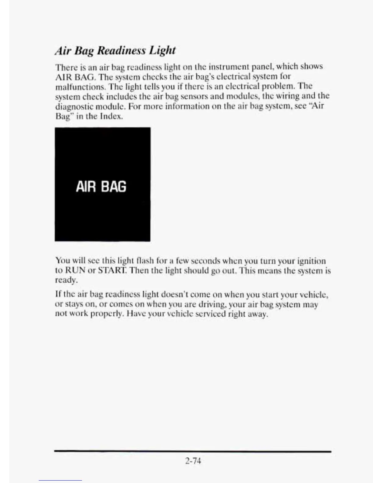 an air bag readiness light on the instrument panel, which