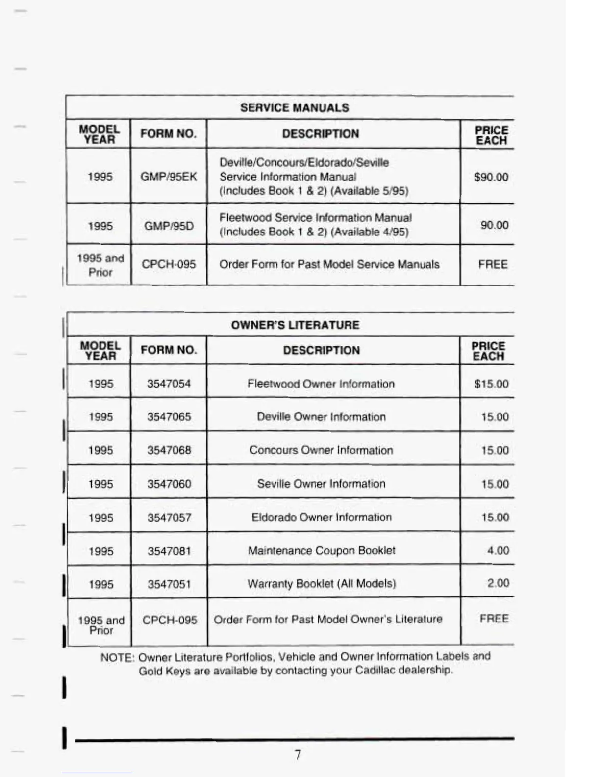 Order Form for Past Model Owner's Literature