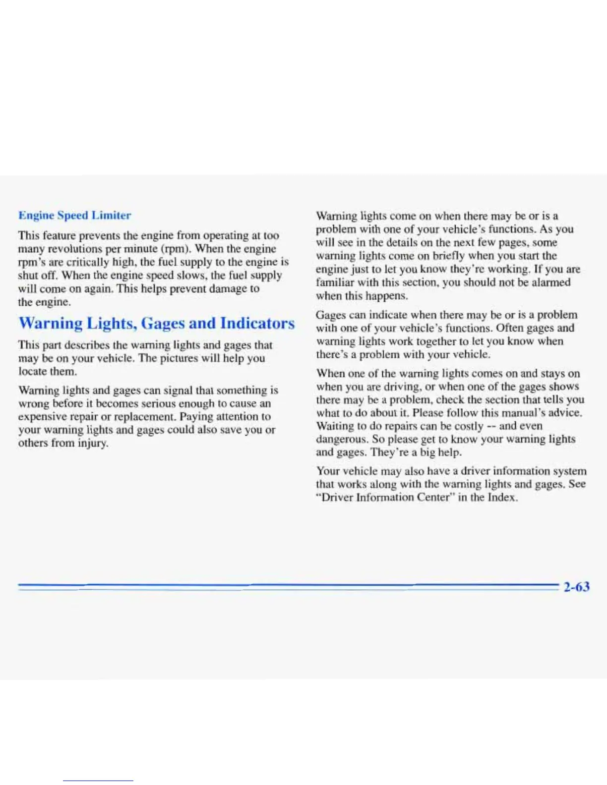 This part describes the warning lights and gages that