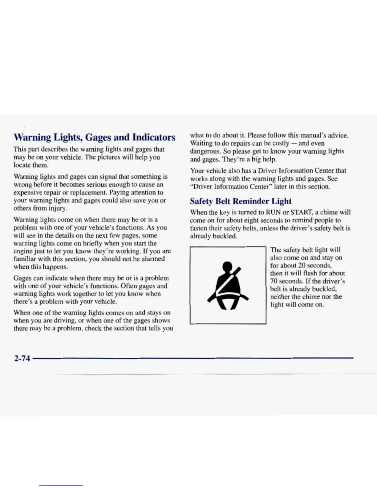 describes the warning lights and gages that