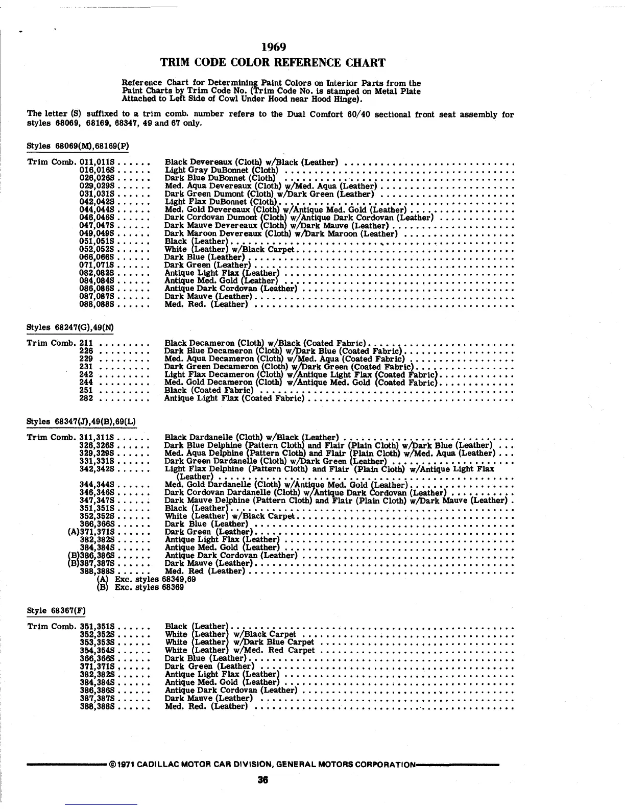 The letter (S) suffixed to a trim comb, number refers to the Dual Comfort 60/40 sectional front seat assembly for