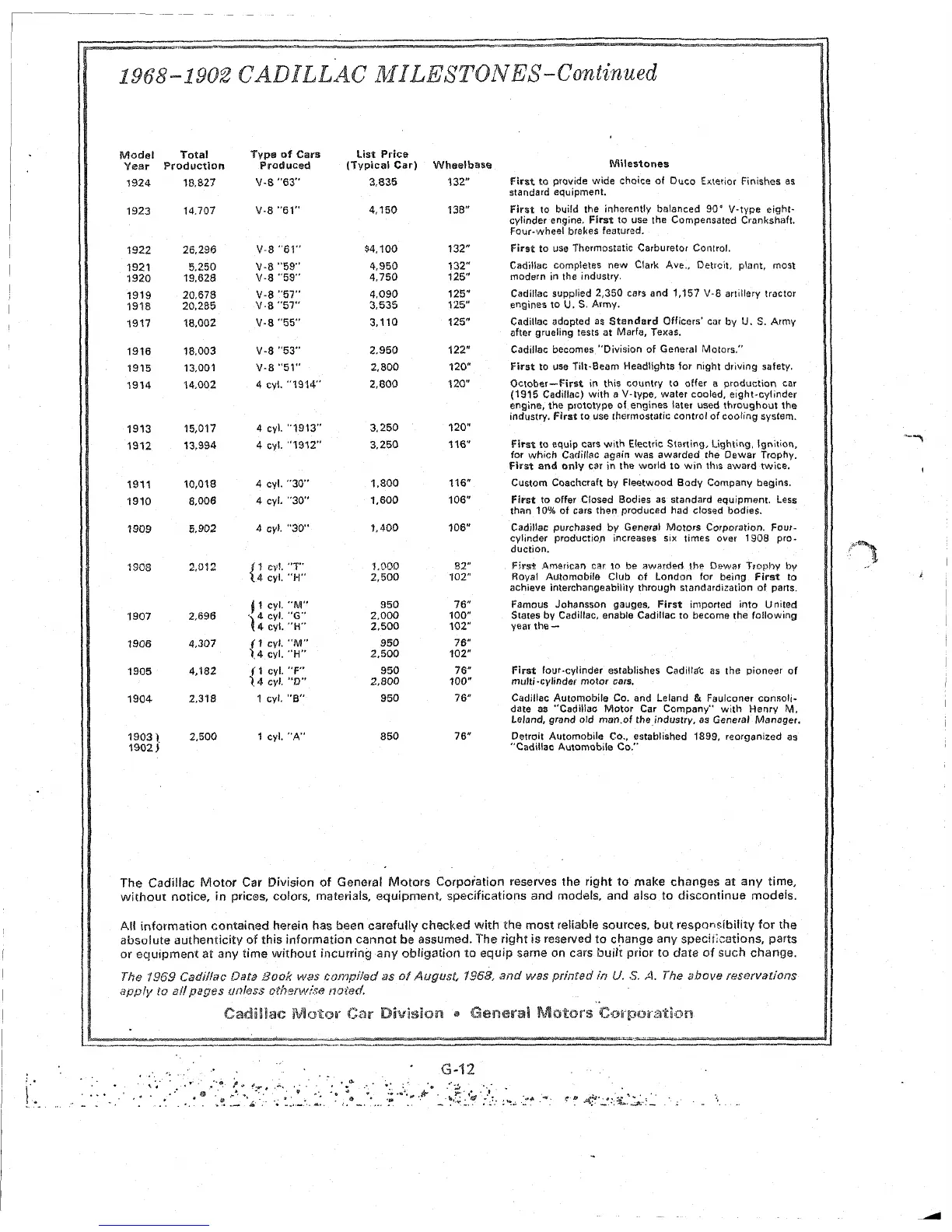 The 1969 Cadillac Data Book was compiled as of August 1963, and was printed in U. S. A. The above reservations