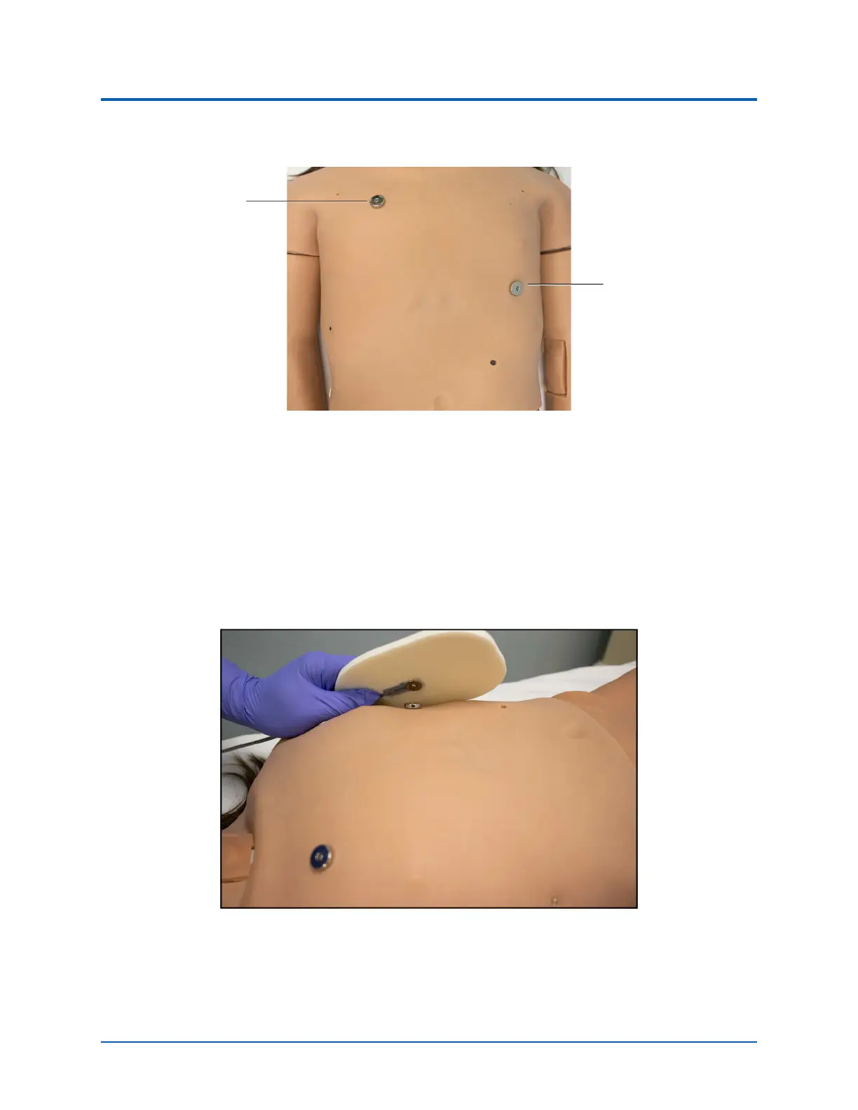 appropriate locations on the manikin: one pad on the right side of the chest below the collarbone