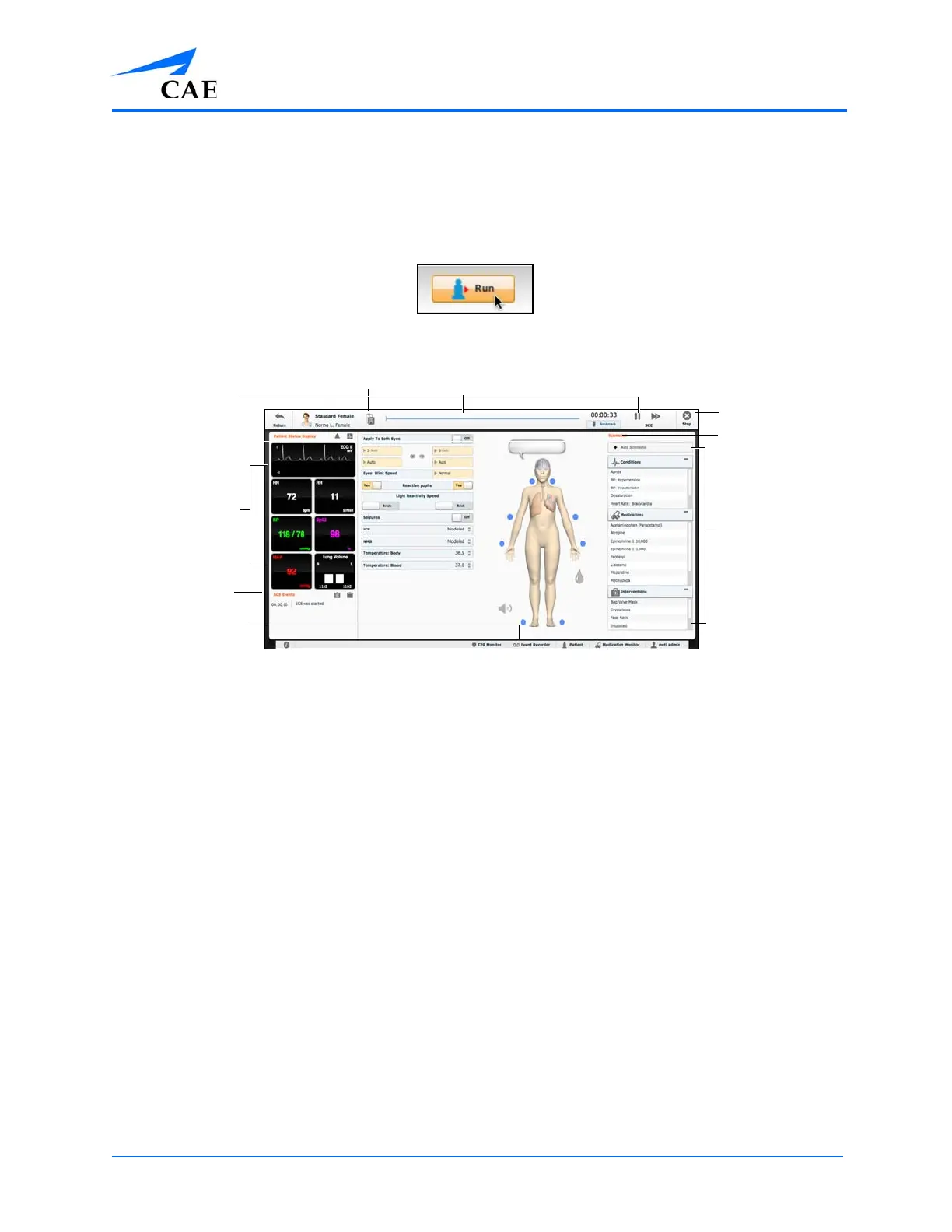 From the Run screen, users can manage the SCE, perform interventions, view physiological status and