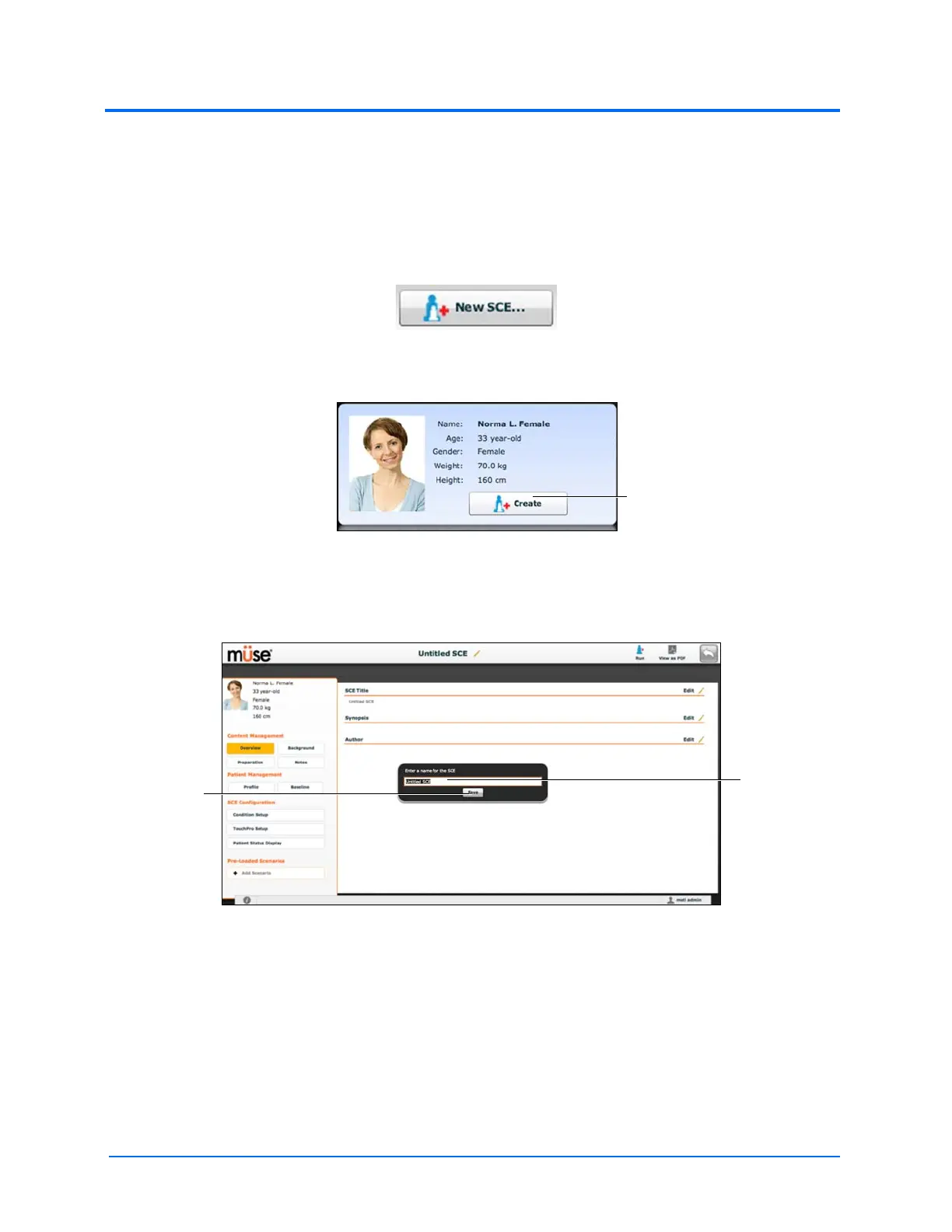 Creating an SCE requires naming the SCE and selecting a Base Patient.