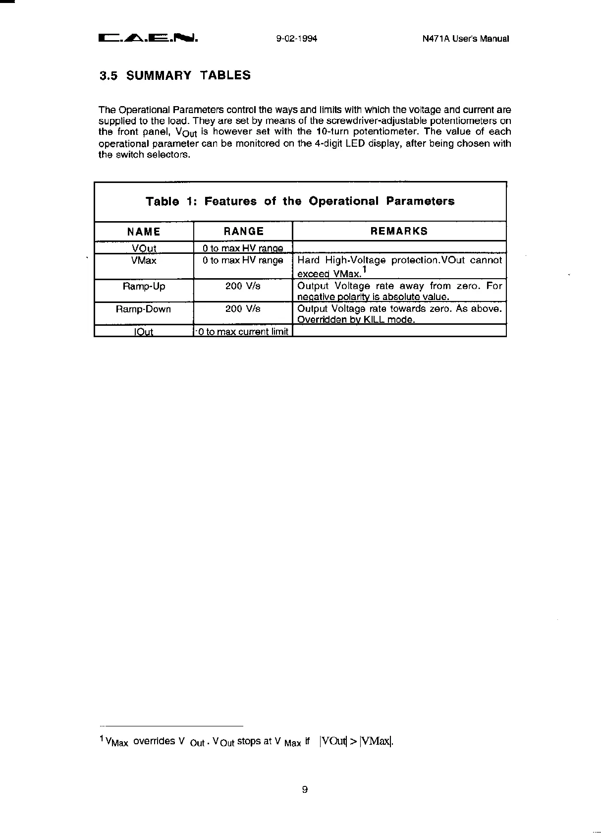 Caen N471A - Features of the Operational Parameters