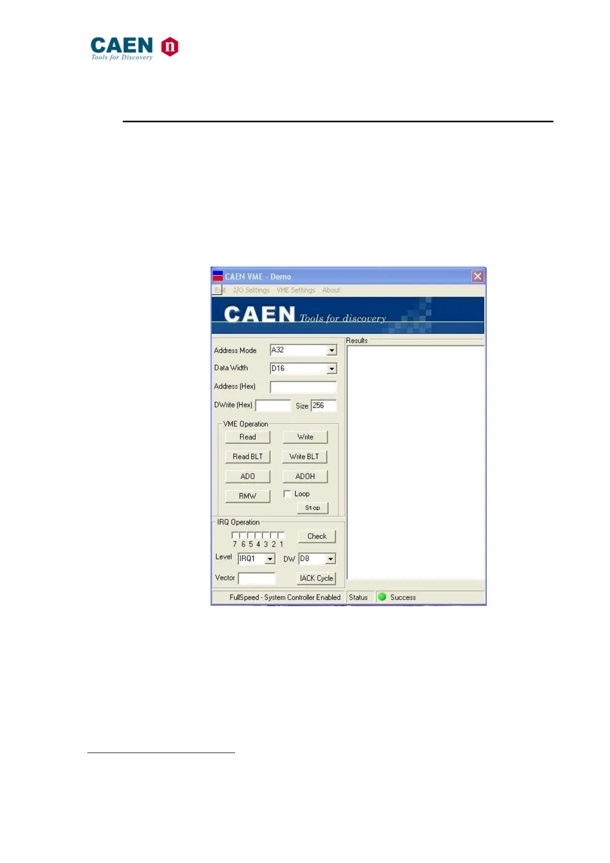 the VME Operation buttons allows to select the desired cycle. The operation results are