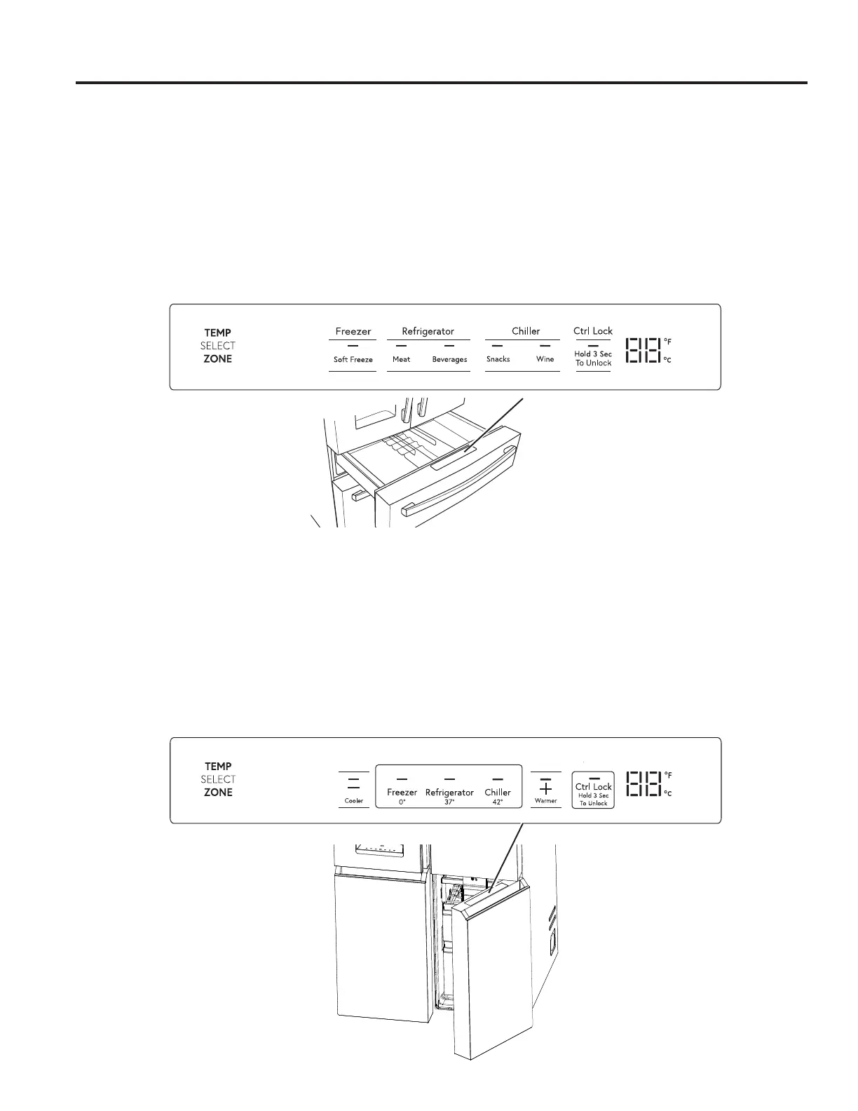 El panel de control de Select Zone (Zona de Selección) se encuentra en la parte superior de la puerta inferior del lado derecho.