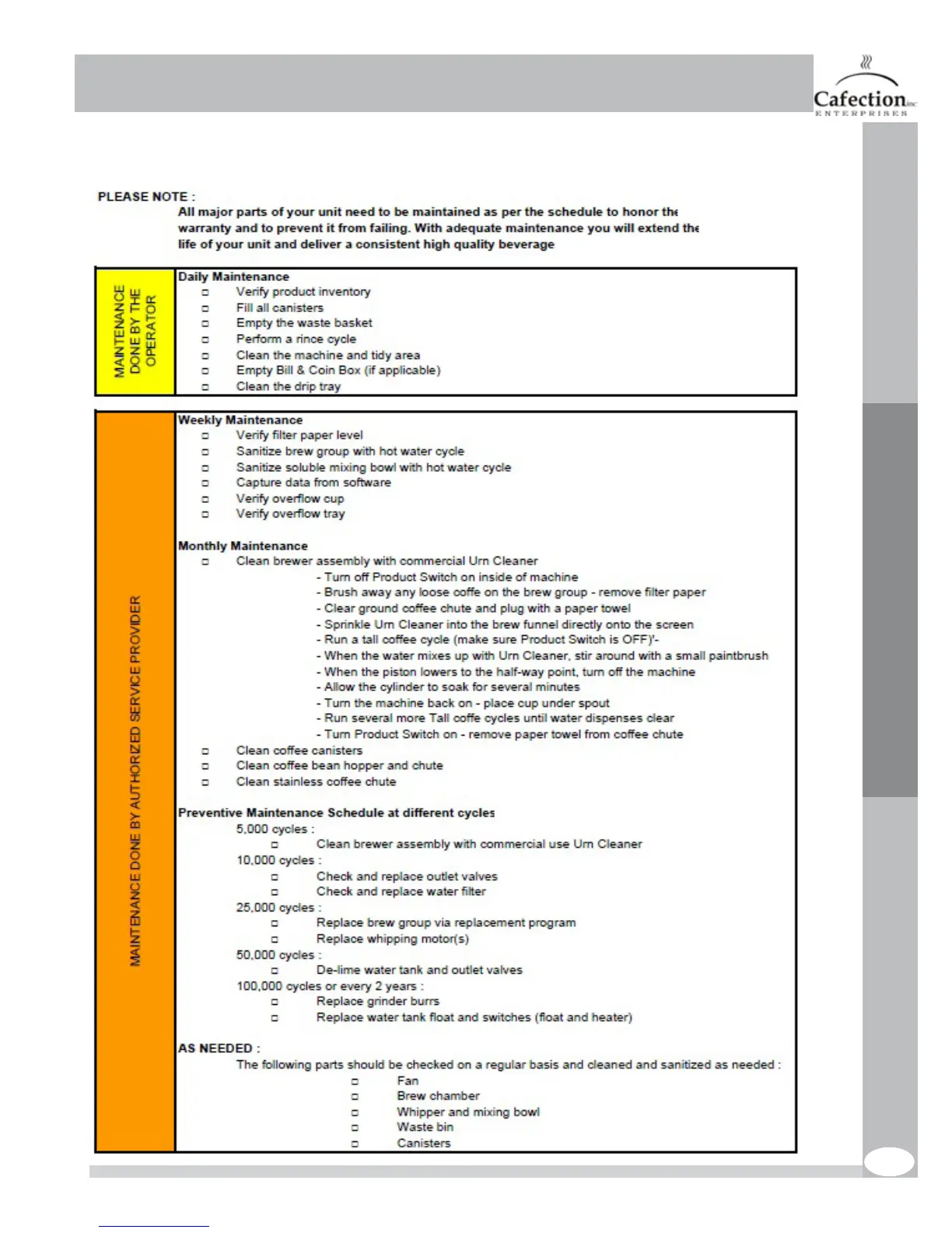 Cafection Avalon Galleria - Annex 1 Full Maintenance Schedule