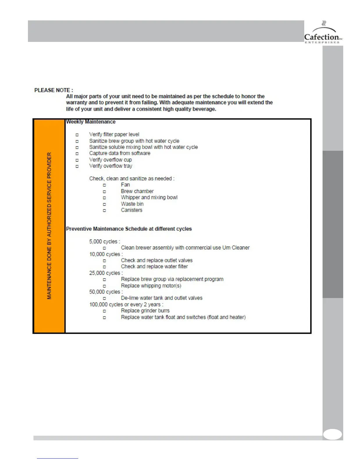 Cafection Avalon Galleria - Annex 3 Weekly Maintenance Schedule