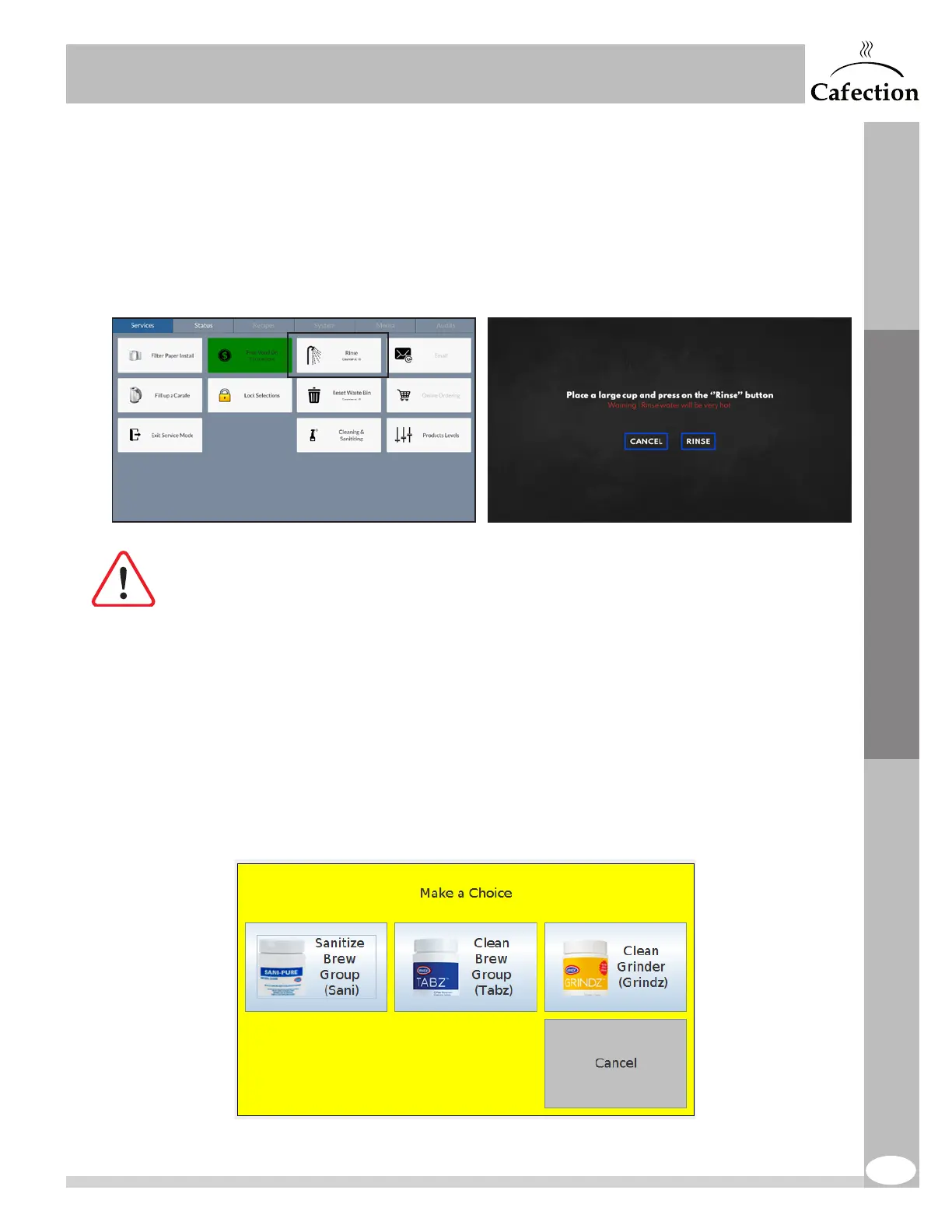 To perform a rinse, access the Service mode by tapping in order on the top left, bottom left and
