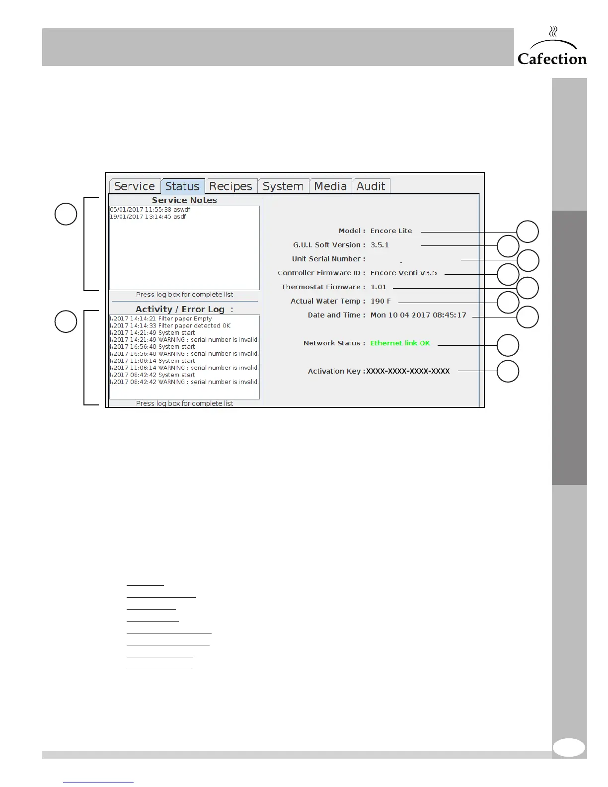 10. Activation key of the brewer. It is used to register the machine on Sophia - Global Management