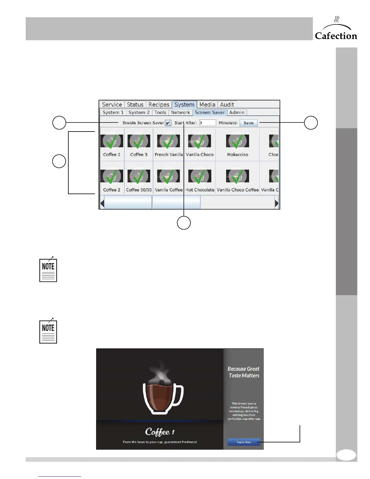 2. Select the beverage(s) to be displayed while the screen saver is ON. A green